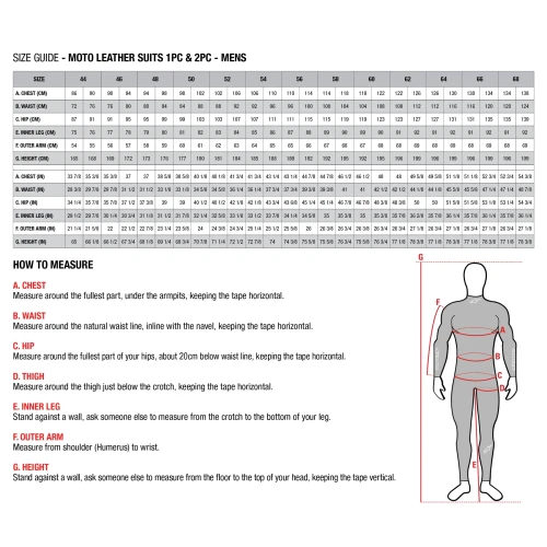 | F. Outer Arm (cm) | 49–50 | 51–52 | 53–54 | 55–56 | 57–58 | 59–60 | 61–62 | 63–64 | 65–66 | 67–68 | 67–68 | 69–70 | 69–70 |