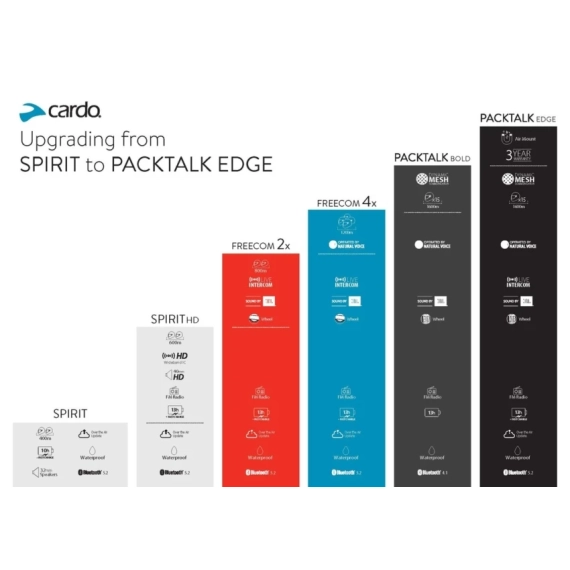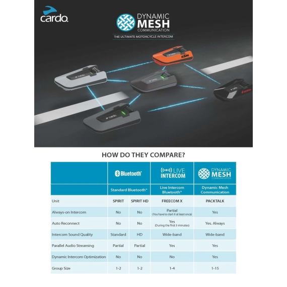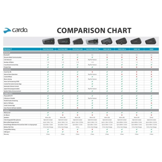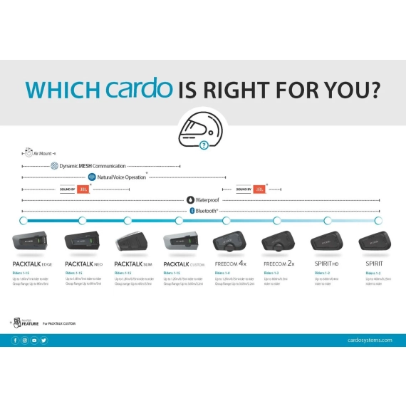 Kompatibel med alle andre Bluetooth-enheter, telefoner, GPS-er og TFT-systemer. Funksjoner inkluderer musikkdeling, VOX (voice operating) og kontroll via Cardo-appen. Naturlig stemmestyring, Live Intercom og kontrollhjul for enkel betjening. Mulighet for private chat, samt OTA oppdatering.