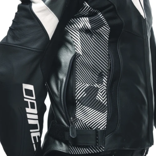 Avro 5 er laget i Tutu-kuskinn med S1 bi-elastiske paneler og Microelastic 2.0, noe som gir en tettsittende og bevegelig passform tilpasset aktiv kjøring. Den MotoGP™-inspirerte Veloce Racing-kragen reduserer trykk mot halsen, mens beskyttelsene følger Daineses racingstandarder: komposittbeskyttere på skuldre og albuer, sammen med utskiftbare aluminiumplater på skuldrene.