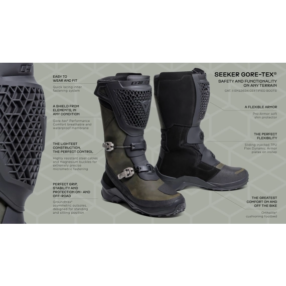 Dainese Seeker Gore-Tex® Boots er det ultimate valget for motorsyklister som ønsker en støvel som takler både vei og terreng, med topp beskyttelse, komfort og allsidighet for både turer på vei og i terrenget.
