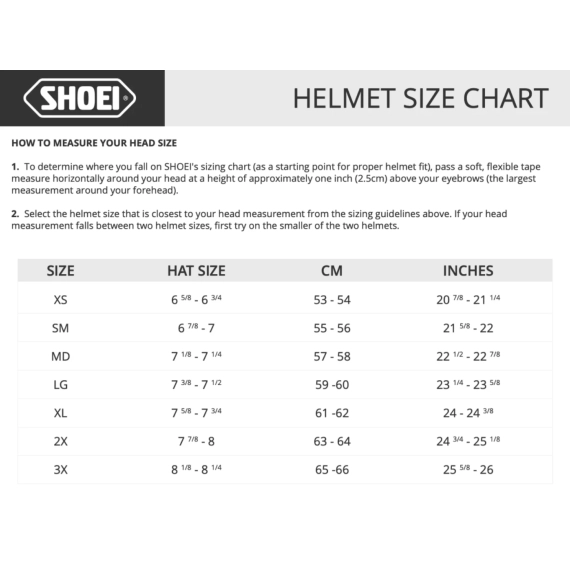 Størrelsestabell – Shoei hjelmer