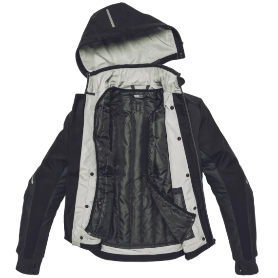 Warrior Lite-beskyttere (CE Level 1) er inkludert i skuldre og albuer, og jakken har klargjort innfesting for ryggbeskytter i både CE Level 1 og Level 2. Reflekspaneler øker synligheten ved kjøring i mørket. Den avtakbare hetta har justerbare snorer og kan fjernes når du ønsker en renere kjøreprofil.